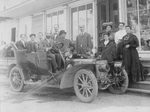 Description :GROUPE DE PERSONNE AUTOUR D'UNE AUTOMOBILE. MONSIEUR DIONNE EST ASSIS DANS L'AUTOMOBILE.