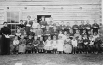 Description :A L'EXTERIEUR DE L'ECOLE, LES ELEVES ET LEUR PROFESSEUR SONT PHOTOGRAPHIES DEVANT LA PORTE. LES ELEVES ONT APPROXIMATIVEMENT, ENTRE 5 ET 15 ANS. IL Y A DES GARCONS ET DES FILLES.