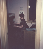 Description :RECEPTIONNISTE DANS SON BUREAU. DEVANT ELLE, UNE PETITE CONSOLE DE TELEPHONE.