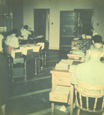 Description :1.1 : BUREAU DES SECRETAIRES OU 7 PERSONNES TRAVAILLENT. A DROITE, EN HAUT (4E) ON VOIT YVAN PERRAULT ET JUSTE EN DESSOUS, MONIQUE LETOURNEAU. - 1.2 : BUREAU DES VENTES. 4 FEMMES Y TRAVAILLENT.