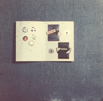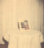 Description :2.1 : LE CELLO FRONT CABINET; DEVANT UN RIDEAU BLANC, SUR UNE TABLE RONDE, RECOUVERTE D'UNE NAPPE BLANCHE, UNE BOITE EN CARTON BLANC CONTENANT DES BOBINES DE FILS DE COULEUR. - 2.2 : EMBROIDERY MASTER CABINET; TOUJOURS SUR LA MEME TABLE, UNE B...