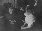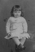 Description :ENFANT DE 3 ANS ENVIRON, ASSISE SUR UN TABOURET. ELLE PORTE UNE PETITE ROBE AVEC DENTELLES, DES COLLANTS DE LAINE ET DES SOULIERS QUI MONTE JUSQU'A LA CHEVILLE.