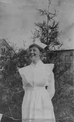 Description :MME WIGGETT DEBOUT DEVANT UN ARBUSTE, EN COSTUME D'INFIRMIERE.