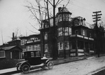 Description :VUE SUR L'EXTERIEUR DE LA MAISON DU DR J.AIME DARCHE DE STYLE VICTORIEN SECOND EMPIRE EN BOIS ET EN BRIQUES. DEVANT LA MAISON, ON VOIT UN AUTOMOBILE ET UN ENFANT.