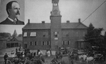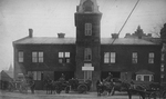 Description :VUE SUR LA CASERNE DES POMPIERS (STATION DE FEU NO 1) CONSTRUITE EN 1877 SUR LA RUE MARQUETTE LA OU SE TROUVE ACTUELLEMENT L'AILE OUEST DU SEMINAIRE ST-CHARLES. A L'EXTREME GAUCHE, LE CHEF DE POLICE ET DES POMPIERS, M.H.O. CAMIRAND. A L'AVANT,...
