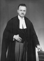 Description :PORTRAIT D'ARMAND NADEAU, DEBOUT AVEC SA TOGE D'AVOCAT.