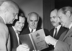 Description :CINQ MEMBRES DU PERSONNEL DE LA SSMFI REGARDENT L'ALBUM DU CENTENAIRE. ON RECONNAIT M.JEAN PROSPER GAUTIER SUR LA PHOTO (2e PAR LA DROITE).
