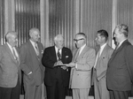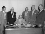 Description :V.MONGEON EST ASSIS ET SIGNE UN DOCUMENT. IL EST ENTOURE DE GAUCHE A DROITE DE S.WOLF, C.B.HOWARD, BENJAMIN CAMPBELL (BUD) HOWARD, J.TUPKER ET H.J.KENNEDY.