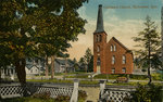 Description :VUE SUR LA FACADE DE L'EGLISE CHALMERS DE RICHMOND (EN BRIQUES). A L'ARRIERE-PLAN, DES MAISONS.