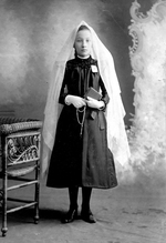 Description :JEUNE FILLE DEBOUT, EN TENUE DE PREMIERE COMMUNION.