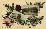 Description :A TRAVERS UN MONTAGE DE GERBES DE FLEURS, ON A PHOTOGRAPHIE DEUX CARTES POSTALES: L'UNE MONTRANT LE "NEW SHERBROOKE HOUSE" ET L'AUTRE, LE "MAGOG HOUSE".