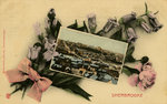 Description :SUR UNE GERBE DE FLEURS EST DEPOSEE UNE CARTE POSTALE "BIRDS HIGH VIEW LOOKING WEST" MONTRANT UNE PARTIE DE LA VILLE DE SHERBROOKE.