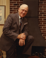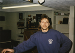 Description :ROBERT BLOUIN DEVANT UN FOYER. IL Y A UN PETIT MUR DE BRIQUE ROUGE DE CHAQUE COTE DE LA CHEMINEE.