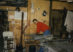 Description :RICHARD BLOUIN TRAVAILLE SUR LE CONVOYEUR. A L'AVANT, UN GROS PLATEAU DE SCIAGE.