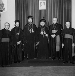 Description :VISITE APOSTOLIQUE REUNISSANT A SHERBROOKE DIVERS PRELATS DE LA CHRETIENTE DONT CERTAINS EVEQUES CANADIENS AINSI QUE DES POPES DE L'EGLISE ORTHODOXE. - 3.1 ON RETROUVE DE GAUCHE A DROITE: MGR TETREAULT, MGR ZAKKA BECHIR, SECRETAIRE DU PATRIARC...