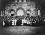 Description :LE CURE STANISLAS GERVAIS ET L'ABBE LEONIDAS ADAM EN COMPAGNIE DES PAROISSIENS DE ST-THEOPHYLE D'ELY DE RACINE REUNIS A LA PORTE DE L'EGLISE APRES LA MESSE
