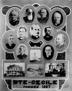 Description :ON RETROUVE 11 PORTRAITS D'HOMMES RELIGIEUX QUI ONT TRAVAILLE A L'EDIFICATION DE LA PAROISSE DE STE-CECILE DE WHITTON DE 1887 A 1931. AU BAS, LA 1ERE EGLISE ET LE PRESBYTERES.