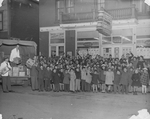 Description :REGROUPEMENT D'ENFANTS ET D'ADULTES AVEC UNE POMME A LA MAIN DEVANT LA BOUCHERIE LEBLANC ET FRERE ET L'EPICERIE FRONTENAC, PROPRIETE DE M MORIN, SUR LA RUE FRONTENAC. LE CAMION DE THOMPSON & ALIX EST A GAUCHE. DES HOMMES DISTRIBUENT LES POMMES...