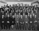 Description :REGROUPEMENT DES EMPLOYES DE THOMPSON & ALIX POUR UNE PHOTO DE GROUPE. 67 PERSONNES SONT PLACEES SUR 8 RANGEES. A L'ARRIERE, LE SIGLE DE LA COMPAGNIE. - RANGEE DE BAS : LEO-PAUL LAPIERRE; HENRI GAUDET; GERMAINE DUSSAULT; RAOUL BLAIS (FRERE DE ...