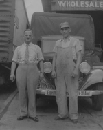 Description :J.L. EMILE BLAIS PORTANT CRAVATE, PANTALON A BRETELLES ET TENANT UNE CIGARETTE A LA MAIN EST ACCOMPAGNE DE LUCIEN LACHANCE PORTANT CASQUETTE ET VETEMENTS DE TRAVAIL, DEVANT UN CAMION DE THOMPSON & ALIX. UNE PUBLICITE DE L'EXPOSITION AGRICOLE E...