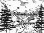 Description :DESSIN DE ROGER VUILLEMIN REPRESENTANT LA CENTRALE FRONTENAC ET LE BARRAGE NO 3. PLUS LOIN LE PONT WOLFE, MAINTENANT DEMOLI, QUI TRAVERSE LA RIVIERE MAGOG.