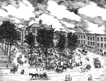 Description :DERRIERE LE MARCHE PUBLIC AU CARRE STRATHCONA, S'ELEVE L'HOTEL DE VILLE DE SHERBROOKE. A DROITE, QUELQUES EDIFICES LONGENT LA RUE FRONTENAC OU PASSENT CALECHES, DILIGENCES ET VOITURES A CHEVAUX DE TOUTES SORTES.