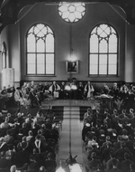 Description :PHOTOGRAPHIE EN PLONGEE DE LA SALLE LORS D'UNE REMISE DE DIPLOMES. VUE DES ETUDIANTS ET DES DIGNITAIRES. GROUPE MIXTE D'ETUDIANTS. PROBABLEMENT PRISE LORS DE LA RECEPTION DU DIPLOME HONORIFIQUE REMIS A JACOB NICOL.