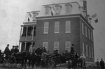 Description :VUE SUR UNE PARTIE DE L'ECOLE POUR FILLES DE MEGANTIC TENUE PAR LES SOEURS DE LA CONGREGATION NOTRE-DAME. DEVANT DES CALECHES ET CHEVAUX CONDUITS PAR DES HOMMES NON-IDENTIFIES.