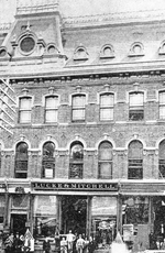 Description :FACADE DU BLOC ODELL QUI ABRITAIT ALORS LA QUINCAILLERIE LUCKE & MITCHELL SUR LA RUE WELLINGTON A SHERBROOKE.