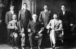 Description :SEPT PERSONNES NON IDENTIFIEES POSENT SUR DEUX RANGS. TROIS ASSIS ET QUATRE DEBOUT DERRIERE EUX.