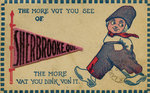 Description :A GAUCHE, UN FANION EN FEUTRE ROSE SUR LEQUEL EST ECRIT "SHERBROOKE QUE." A DROITE UN PETIT BONHOMME EST DESSINE - GENRE PETIT POUCET - IL PORTE UN FOULARD ROUGE ET DES SABOTS.