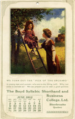 Description :PAGE DU CALENDRIER DE JUIN 1912 PRESENTANT LE DESSIN D'UNE INSTITUTRICE AVEC FILLETTE DANS UNE ECHELLE, REPRESENTANT L'ASCENSION VERS UNE BONNE CARRIERE. AU VERSO, PUBLICITE TEXTUELLE OFFRANT CALENDRIER D'ART ANNUEL DE 1913 ET AUTRES PROMOTION...