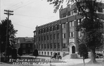 Description :FACADE DE L'HOPITAL AVEC INSCRIPTION DE "THE SHERBROOKE HOSPITAL", AU DESSUS DE LA PORTE D'ENTREE EN VOUTE. A GAUCHE, LES RESIDENCES DES INFIRMIERES. EN AVANT-PLAN AUTOMOBILES DES ANNEES 1920, DONT UNE DECAPOTABLE.