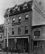 Description :FACADE DE LA 1ere MANUFACTURE DE VETEMENTS WALTER BLUE SITUE SUR LA RUE WELLINGTON (NO 169-171) PRES DU COIN KING. A L'AVANT, DES CLIENTS OU PASSANTS.
