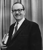Description :PORTRAIT DE MAURICE ALLARD. IL TIENT DES VOLUMES DE SA MAIN DROITE