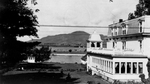 Description :HOTEL CHATEAU DU LAC A MAGOG: VUE SUR LA FACADE DU MONT ORFORD EN ARRIERE PLAN. SOUS-TITRE EN ANGLAIS
