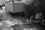 Description :VUE SUR L'ARRIERE DE L'EDIFICE GARB QUI ABRITE LA CENTRALE D'HYDRO QUEBEC A SHERBROOKE. ELEVE SUR PILOTIS, L'EDIFICE EST AU-DESSUS DE LA RIVIERE MAGOG. AU FOND, LE PONT DE CHEMIN DE FER.