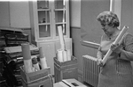 Description :SUR L'UNE DES PHOTOS, ON NE VOIT QUE DES BOITES ET DES OBJETS EMPILES LES UNS SUR LES AUTRES. ON APERCOIT SUR L'AUTRE, MARIE-JEANNE DAIGNEAU, ARCHIVISTE DE LA LA SOCIETE D'HISTOIRE DE SHERBROOKE.
