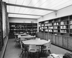 Description :SALLE DE TRAVAIL A L'INTERIEUR D'UNE BIBLIOTHEQUE. ON VOIT 3 TABLES AVEC CHAISES. LE LONG DES MURS IL Y A DES RAYONS AVEC DES LIVRES.