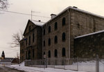 Description :VUE DE BIAIS DE LA FACADE DE LA PRISON DE LA RUE WINTER ET D'UNE PARTIE DU MUR D'ENCEINTE, AVEC A GAUCHE, UN APERCU DU CLOCHER ET DU TOIT DE L'EGLISE PROTESTANTE DE LA RUE FRONTENAC (NO 200)