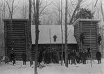 Description :VUE DU CHALET DU CLUB TUQUE ROUGE (EN BOIS ROND). DES MEMBRES (HOMMES) POSENT DEVANT. CERTAINS SONT GRIMPES LE LONG DES EXTREMITES DES BILLOTS.