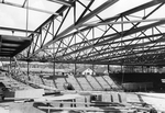 Description :LE PALAIS DES SPORTS DE SHERBROOKE, LORS DE SA CONSTRUCTION. LES GRADINS SONT PRESQUE TERMINES ET LES POUTRES D'ACIER DU TOIT SONT INSTALLEES. 1.2 ET 1.3) ON APERCOIT DES CAMIONS AU CENTRE.