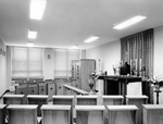 Description :VUE SUR L'INTERIEUR D'UNE PIECE TRANSFORMEE EN CHAPELLE DANS UN EDIFICE MODERNE. UN AUTEL AUTOUR DUQUEL LES BANCS SONT DISPERSES EN DEMI-CERCLE ET DANS UN COIN, UN CONFESSIONAL.