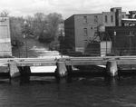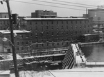 Description :VUE SUR LA MANUFACTURE PATON A SHERBROOKE. SECTION DONNANT SUR LA RIVIERE MAGOG EN HIVER.