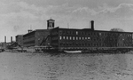 Description :L'USINE PATON DE SHERBROOKE VUE DE LA RIVIERE MAGOG. UNE CHALOUPE EST ACCOSTEE SUR LE BORD.