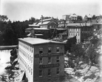 Description :VUE GENERALE DE LA MANUFACTURE PATON A SHERBROOKE DU COTE DE LA RIVIERE MAGOG.