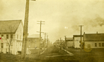 Description :A L'AVANT-PLAN A GAUCHE, BATISSE A 3 ETAGES, EN CLINS DE BOIS AVEC AFFICHE PEARL MANUFACTURING. DERRIERE, MAISON BRIQUELEE, FENETRES ARRONDIES LEGEREMENT. DE L'AUTRE COTE DE LA RUE, PROBABLEMENT MAISONS DE TRAVAILLEURS. 2 PIETONS SUR LE BORD D...