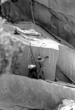 Description :ON VOIT DEUX HOMMES TRAVAILLANT A LA CARRIERE DE GRANIT BEBEE.