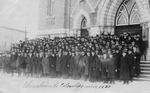 Description :GROUPE DE CHEVALIERS DE COLOMB (ENV. 100) QUI POSE SUR LE PERRON DE L'EGLISE STE-AGNES DE LAC-MEGANTIC