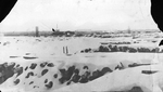 Description :UNE VUE D'ENSEMBLE D'UNE USINE DE PATE ET PAPIER L'HIVER. L'USINE EST AU CENTRE D'UN IMMENSE TERRAIN OU SONT ENTASSE LES CORDES DE BOIS. A L'ARRIERE PLAN, UN TRAIN. PAYSAGE PLAT.